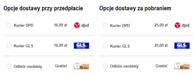 - Wysyłka firmą kurierską - dostawa jest realizowana przez sprawdzoną firmę kurierską DPD lub GLS. Wybranie kuriera oznacza wygodę i pewność, że Twoje zamówienie dotrze na czas za niewygórowaną cenę.