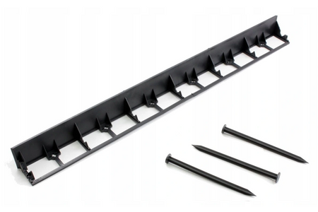 - ZAMOCUJ OBRZEŻA – przy prostych odcinkach użyj 3 kotew na 1 mb, a przy łukach 4–5 szt. Miękki grunt = kotwy plastikowe, grunt kamienisty lub twardy = gwoździe stalowe.